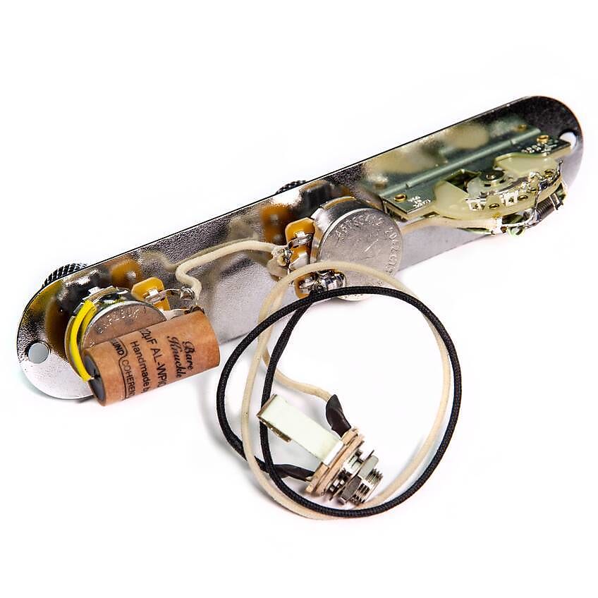 Fully prewired, loaded Telecaster control plate, with volume and tone controls and a traditional 3 way pickup selector.