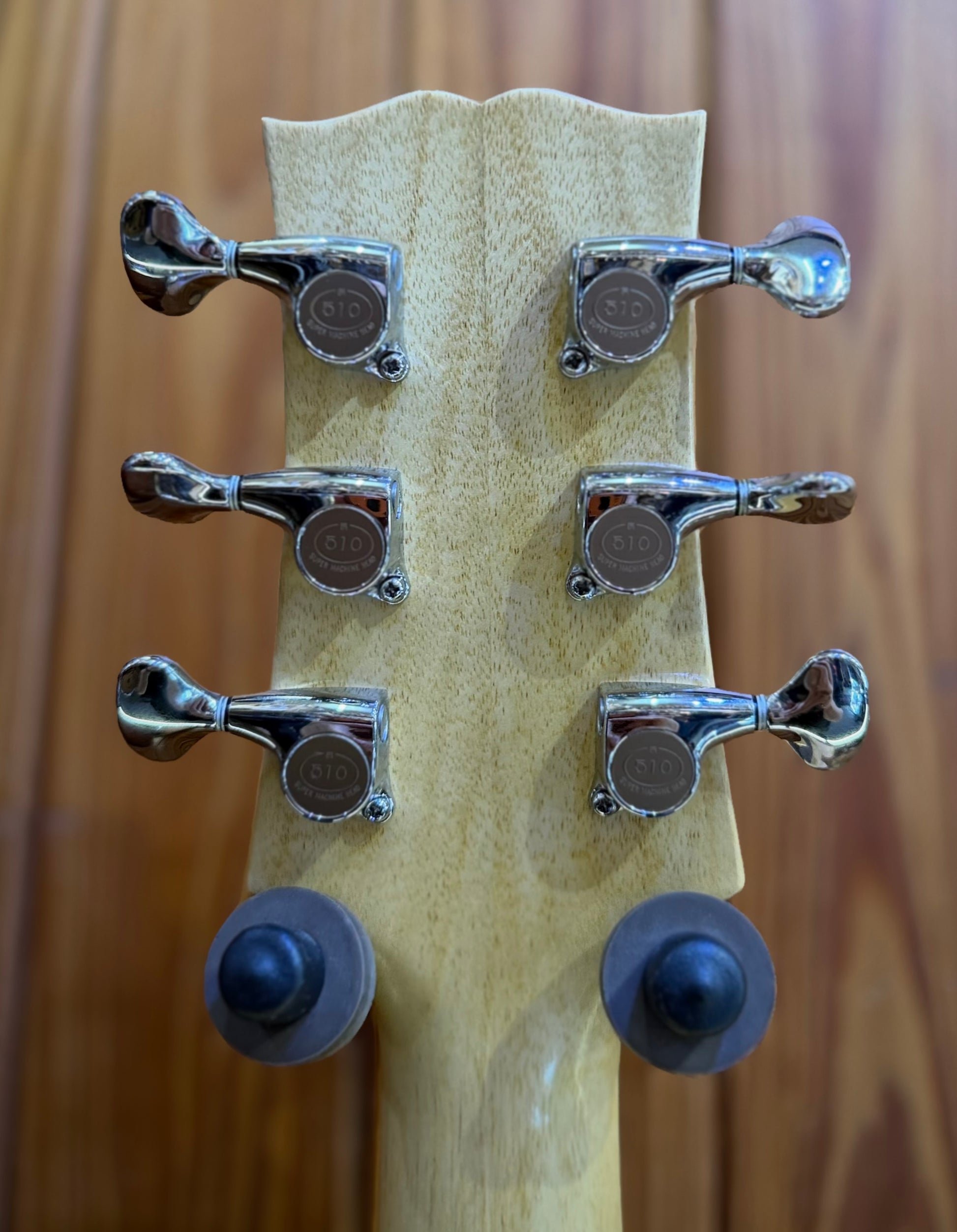 This Small Jumbo has an incredible presence and clarity with the regular jumbo boom tempered by the Sycamore body and the slightly smaller lower bout. Superb all-solid tonewoods, beautiful binding and a gorgeous Ring Gidgee headstock overlay make this a unique instrument.