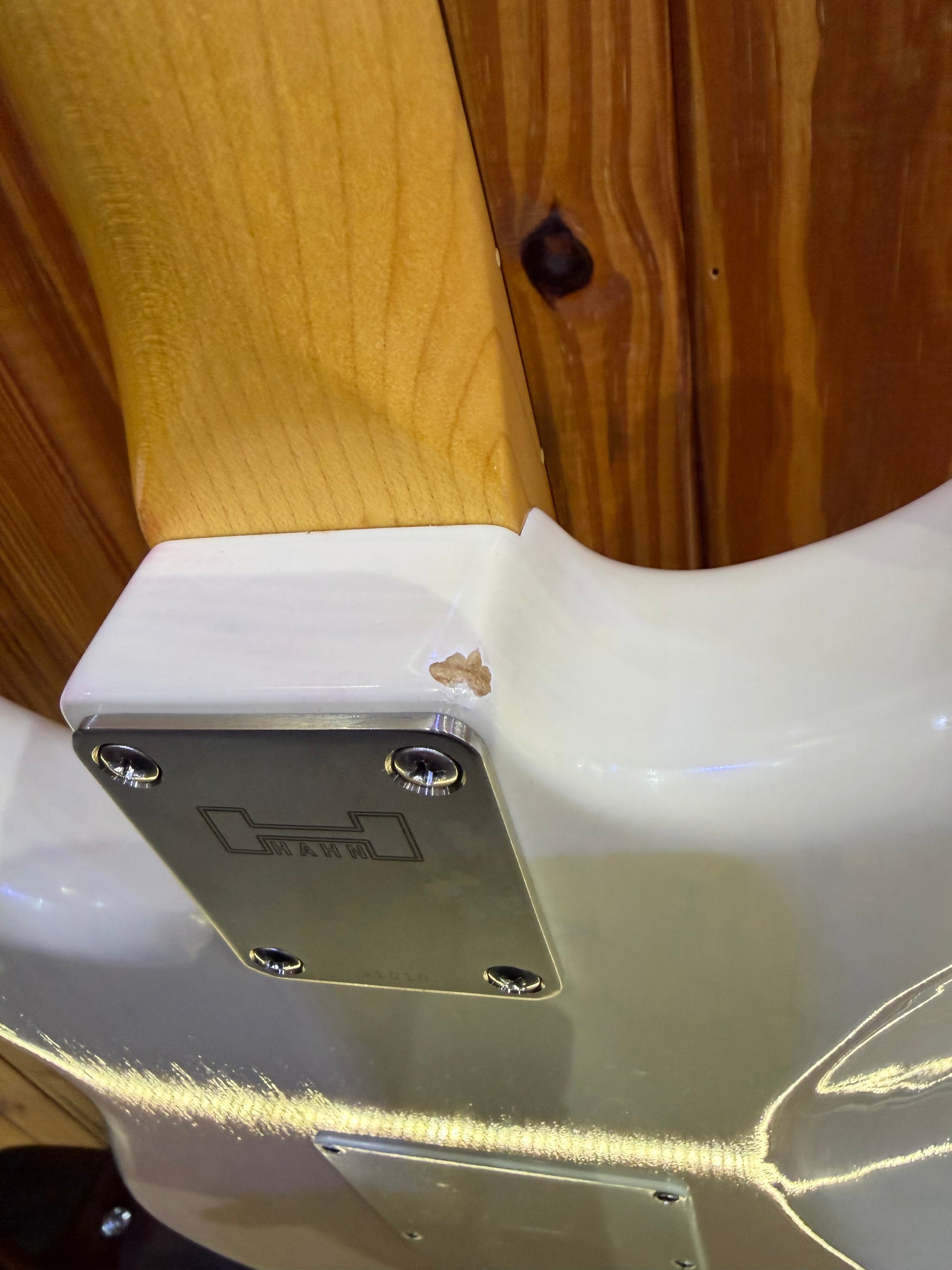 This is a pre-loved guitar in very good condition. There is a small chip out near the neck plate (as seen in the photo) but it doesn't affect playability at all.
