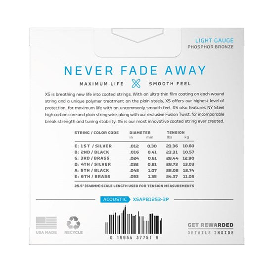 This 3 pack of D'Addario XS Acoustic Phosphor Bronze combines our most popular acoustic alloy with our most advanced string coating technology, resulting in clear tone, smooth feel, and superior tuning stability — all with the longest possible string life. Available in Phosphor Bronze for 6 and 12-string acoustic guitar, ranging from extra-light to medium gauges.