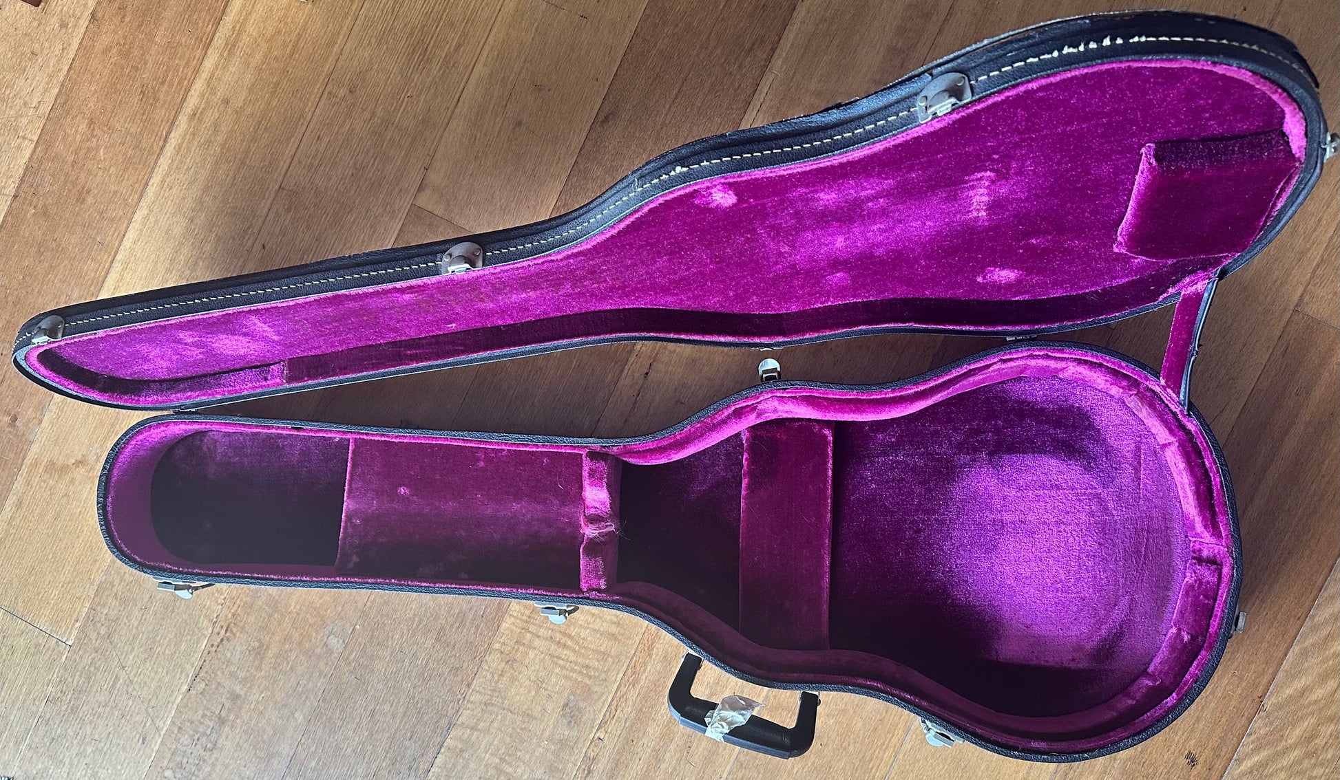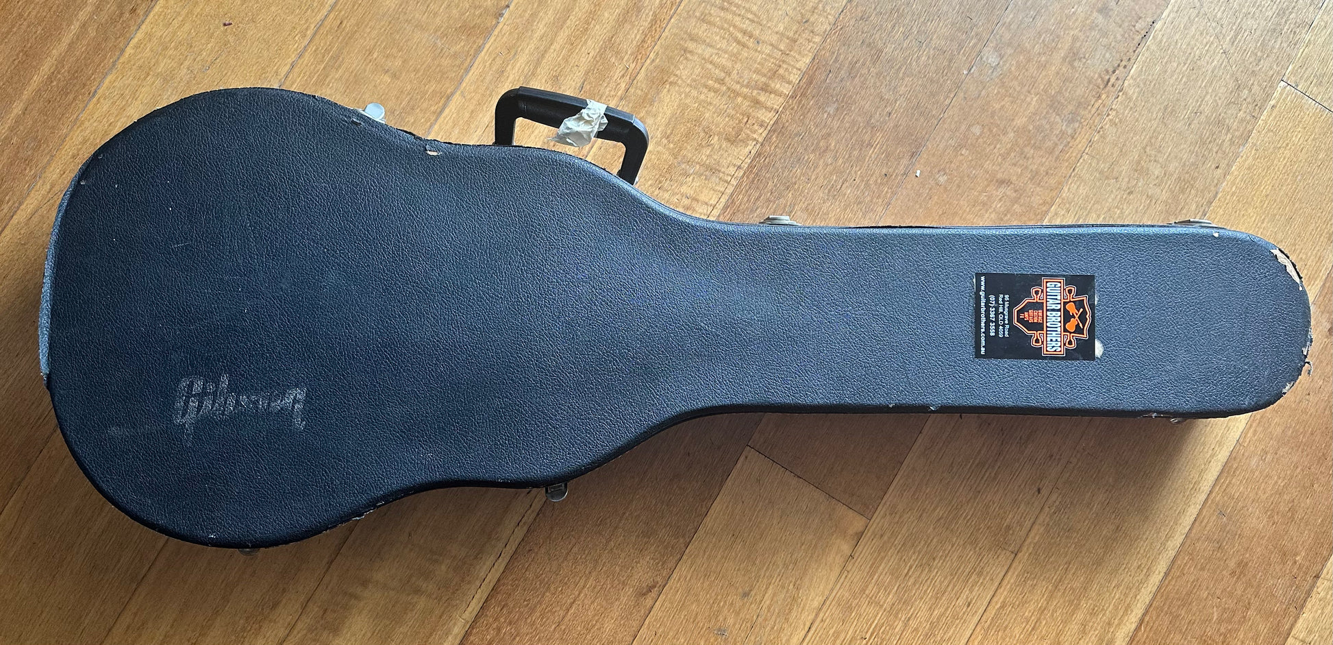 All electronics, pickups, tuners, finish, and both the plastic and chrome-plated metal hardware are correct and original to the guitar. The Gibson-branded ABR-1 bridge with nylon saddles has been replaced; the original bridge, which had collapsed, is included in the case.