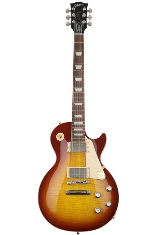 8000227The new Les Paul Standard returns to the classic design that made it relevant, played and loved -- shaping sound across generations and genres of music. It pays tribute to Gibson's Golden Era of innovation and brings authenticity back to life. The Les Paul Standard 60's has a solid mahogany body with an AA figured maple top, and a slim taper 60's-style mahogany neck with a rosewood fingerboard and trapezoid inlays. It's equipped with a classic-style Tune-O-Matic bridge, aluminum stop bar tailpiece, Grover Rotomatic "Kidney" tuners, and gold top hat knobs with silver reflectors. The Burstbucker 61R (neck) Burstbucker 61T (bridge) pickups are loaded with AlNiCo V magnets, audio taper potentiometers and orange drop capacitors.