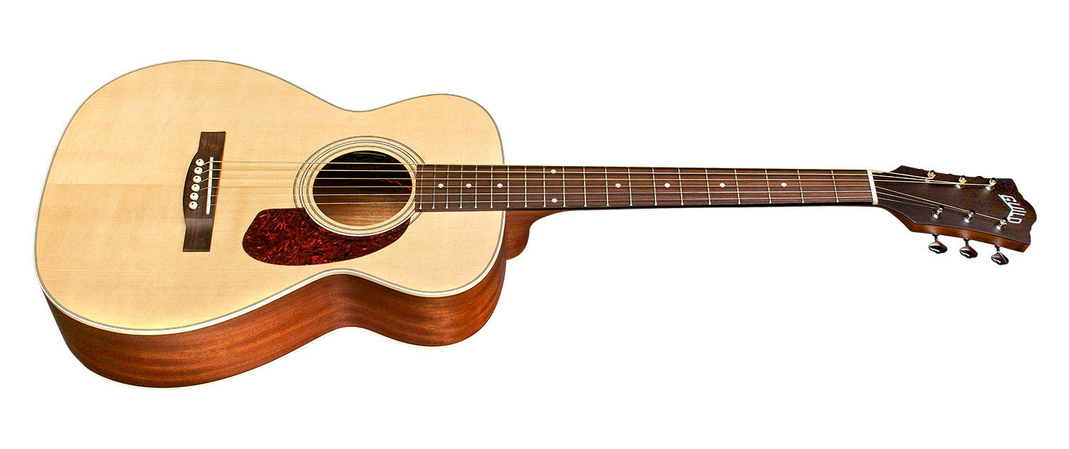 Built with solid spruce top, mahogany sides, and arched mahogany back, the M-240E has a comfortable body and distinctive voice. Guild’s signature arched back design allows for great volume and projection, long sustain, and a lush, full sound. With a 24 3/4” scale length and 1 11/16″ nut width on a vintage shaped Guild neck, this concert size guitar is a joy to play. The M-240E features Guild’s AP-1 pickup, an Indian rosewood fingerboard and bridge, bone nut and saddle, pearloid rosette, period-correct tortoiseshell pickguard, and a matte polyurethane finish. This model also includes Guild’s new lightweight deluxe gig bag.