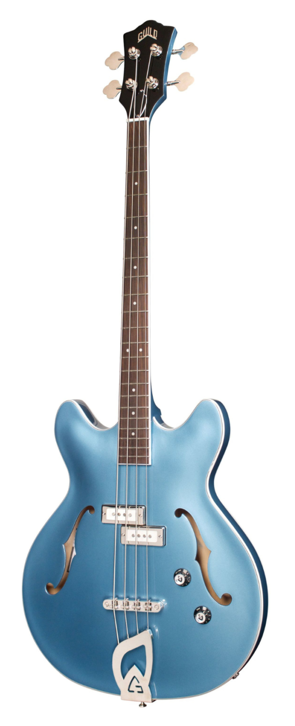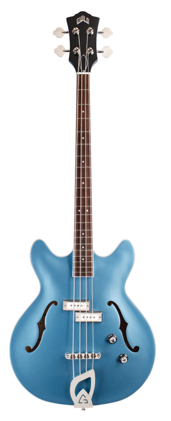 Stable tuning and easy adjustability are provided by the Tune-o-matic bass bridge, and the harp tailpiece adds a touch of Guild’s classic aesthetic, likening the bass to its upright ancestors. Guild’s own BC-1 BiCoil pickups adorn the bass, complete with hum resistant nickel covers and Alnico 5 magnet construction. Combined with the woody nature of semi-hollowbody tone and the volume and tone control, these pickups allow the player to dial in anything from modern, cutting bass tones to wooly, round, vintage tones. Pull up on the Volume Knob to reveal the push-pull vintage switch—a feature that adds presence with rolled down low frequencies, reminiscent of the parallel pickup configuration on vintage Hollowbody basses. Available with maple top, back, and sides in Vintage Walnut, and with Mahogany top, back, and sides in cherry red.