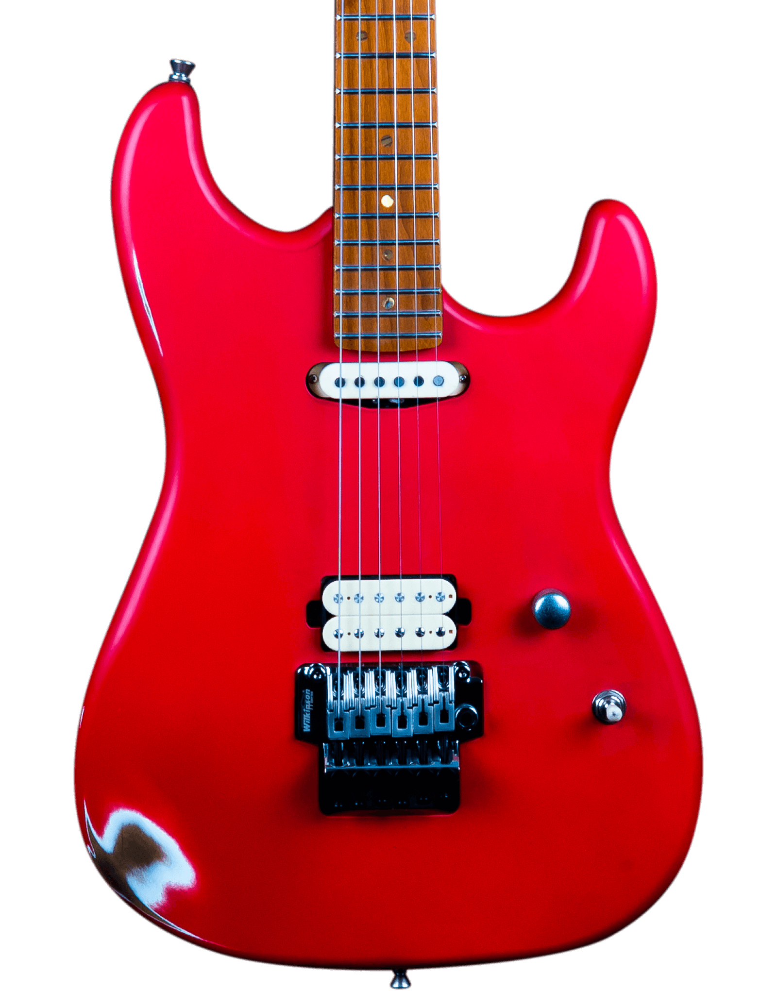 The JET Guitars JS-850 FR Relic Electric Guitar HS Roasted MN, finished in Red, features the combination of an Alnico single-coil and humbucker, both handwound and direct mounted, perfect for everything from smooth bell-like Strat tone, to gained up modern riffs. Premium features not usually found in guitars this affordable, like a Wilkinson Double Locking tremolo, an Alder body, and a Modern C-Profile Roasted Maple neck and fingerboard, make for hours of easy and comfortable playability. A relic finish and aged hardware gives this guitar the look of a played-in vintage instrument, and makes a nice feature of the tonewood's grain.