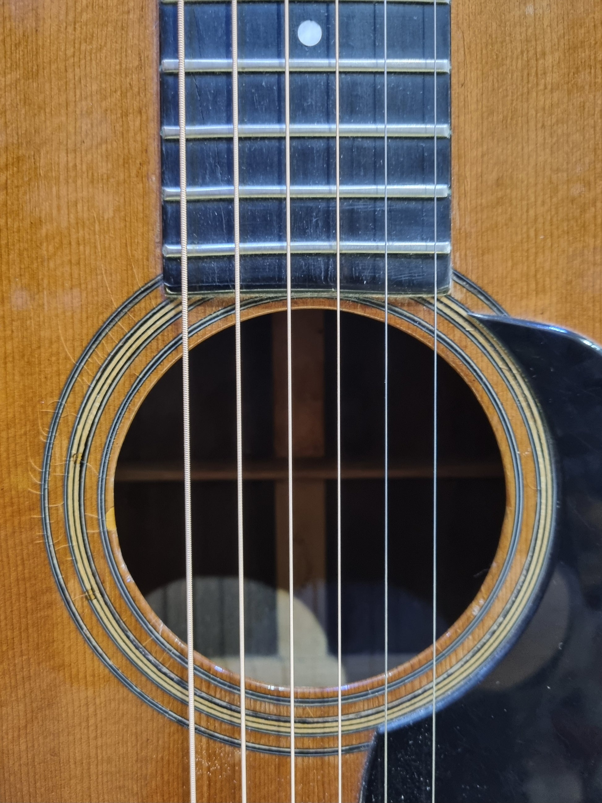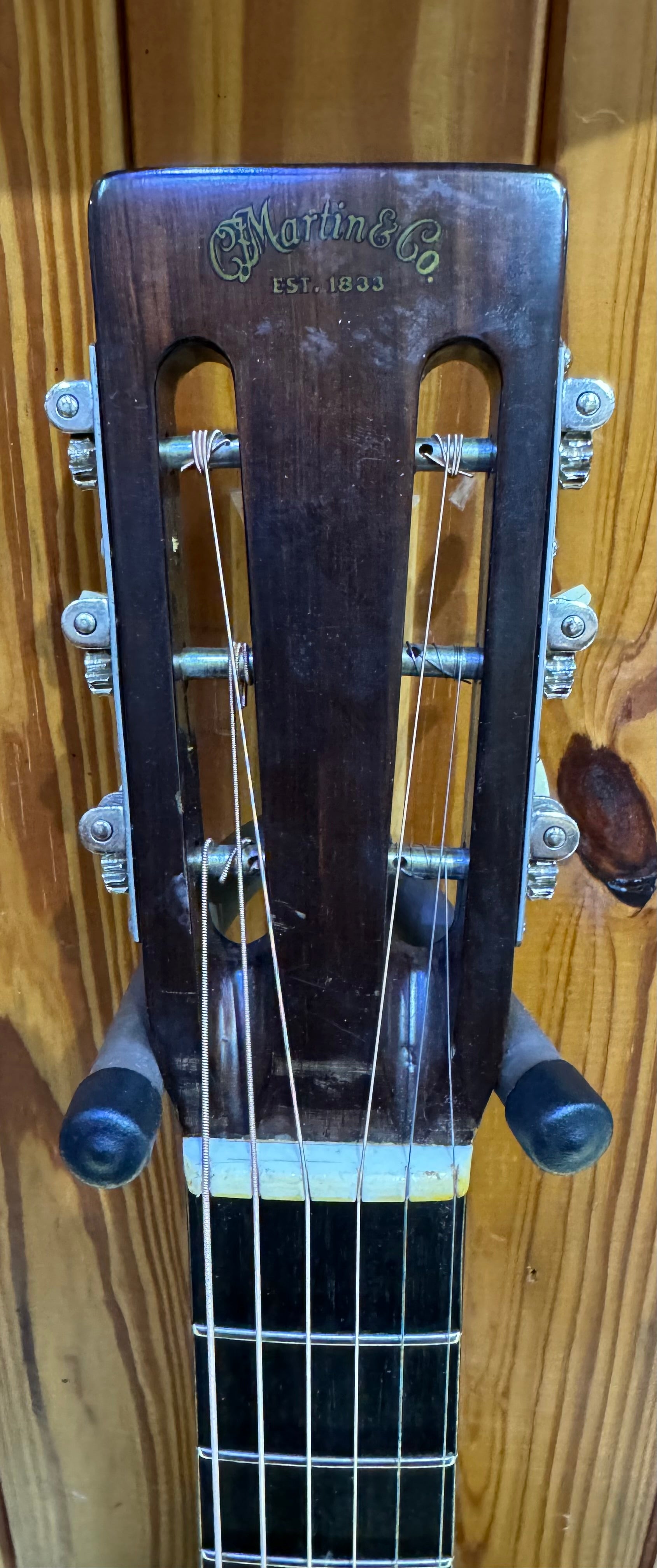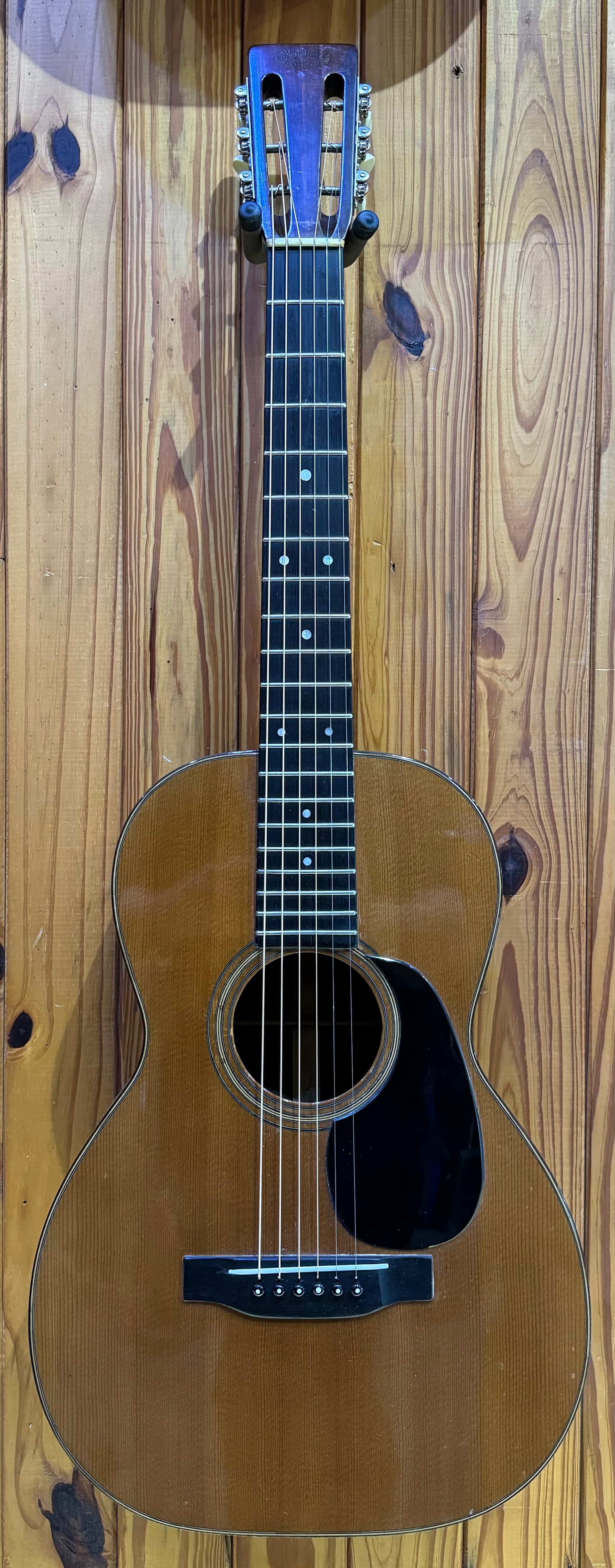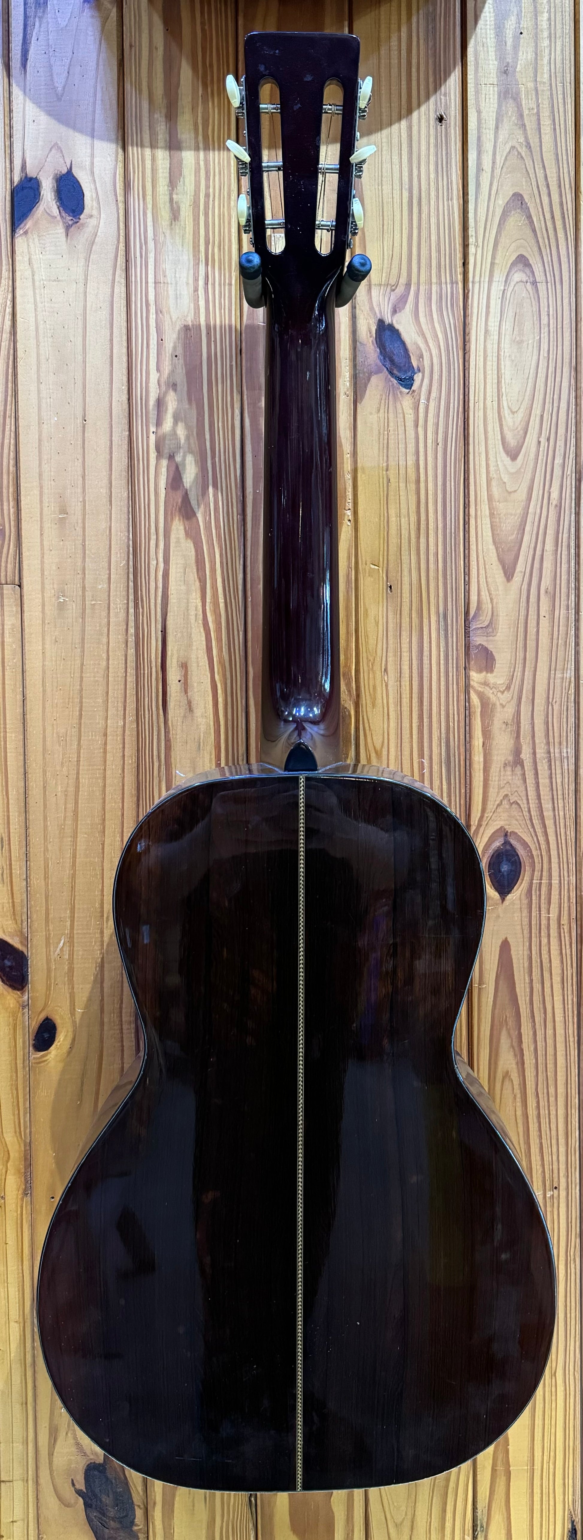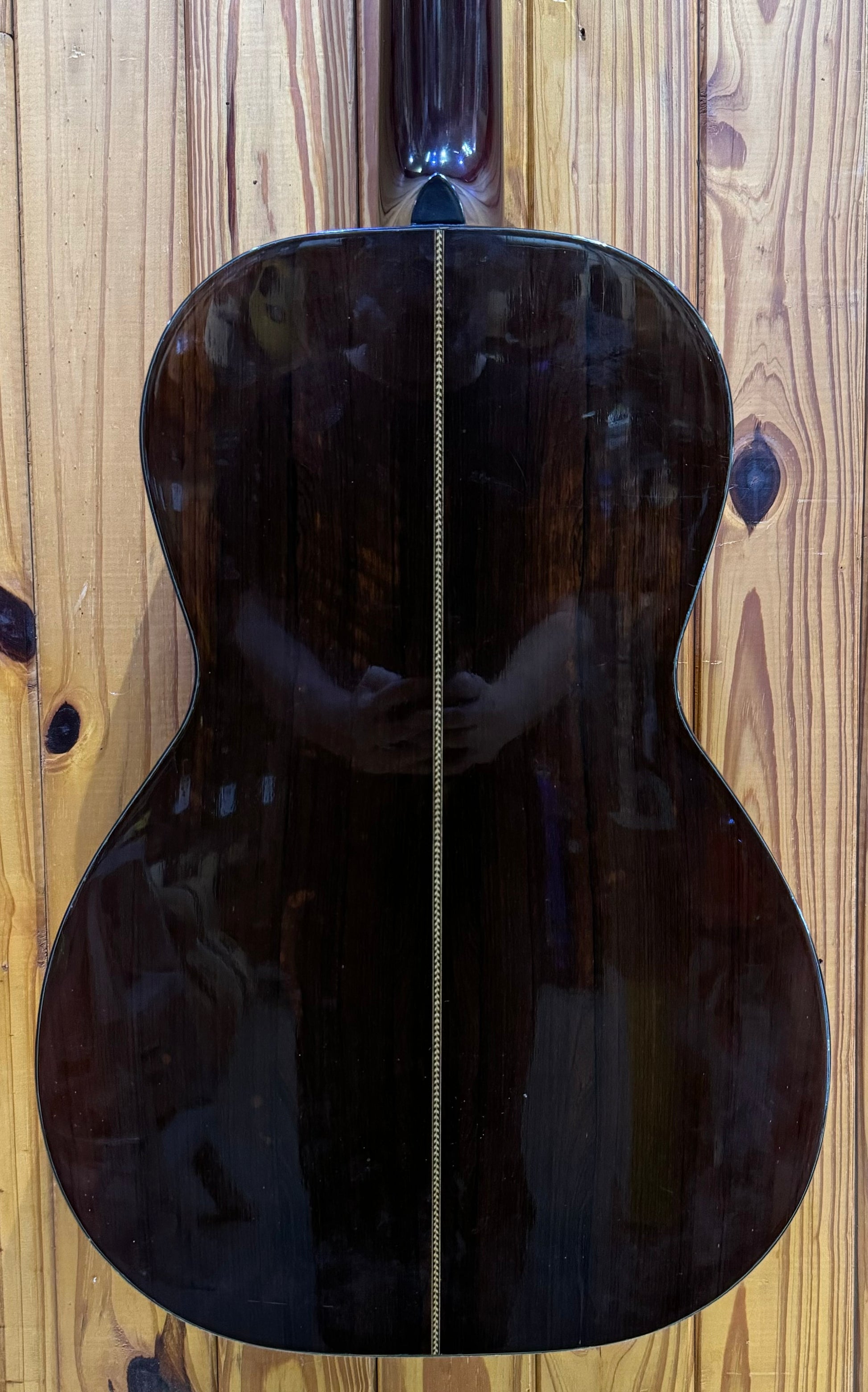 It's nicely built with Brazilian rosewood back & sides, a 12-fret neck join, slotted headstock, and a traditionally wide 46mm nut. Scale length is 24 3/4 inches. This Martin shows some general wear and repair, but on the whole remains in decent shape for its age, with a few notable repairs. It projects very well for its size and has a really balanced tone.