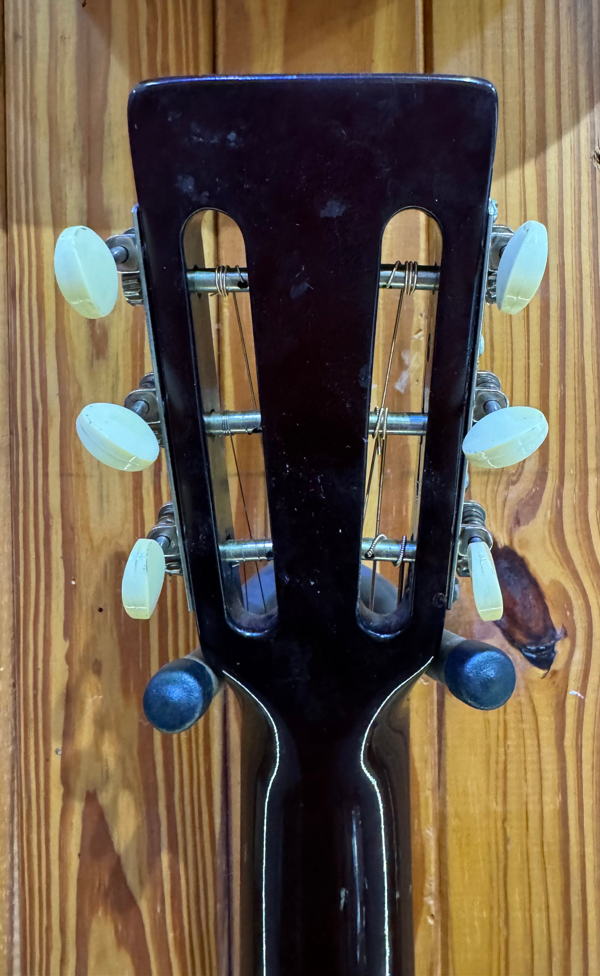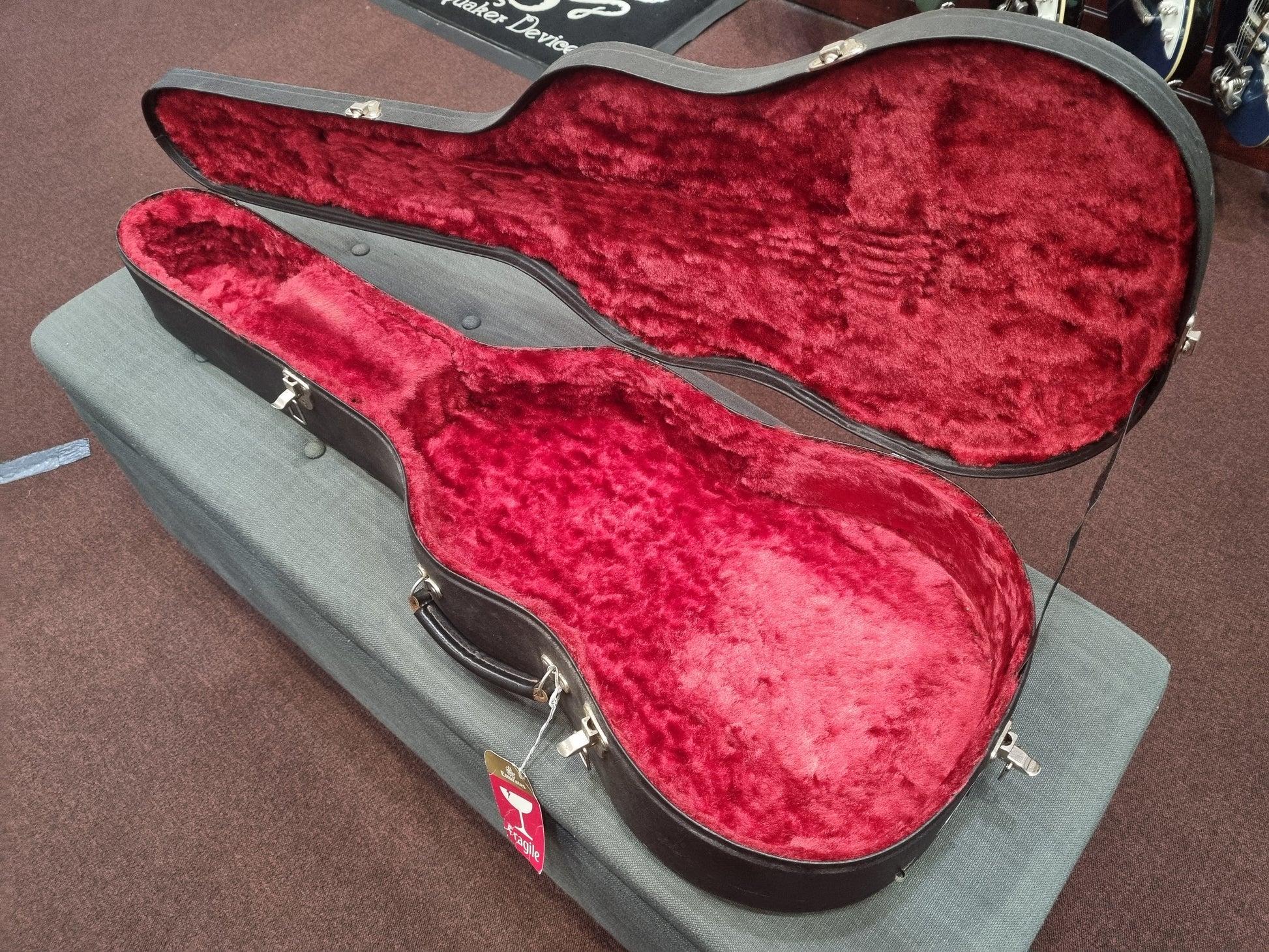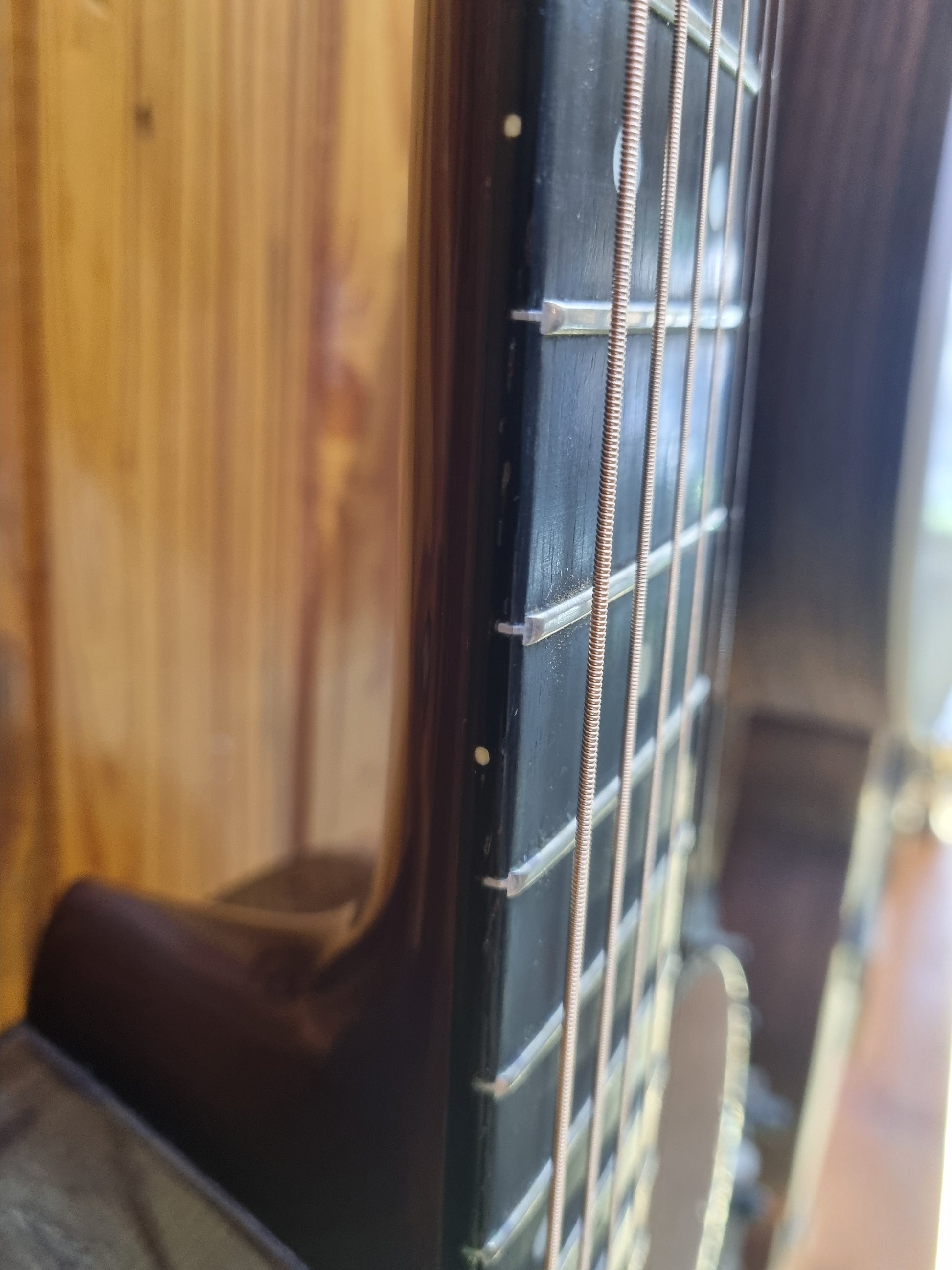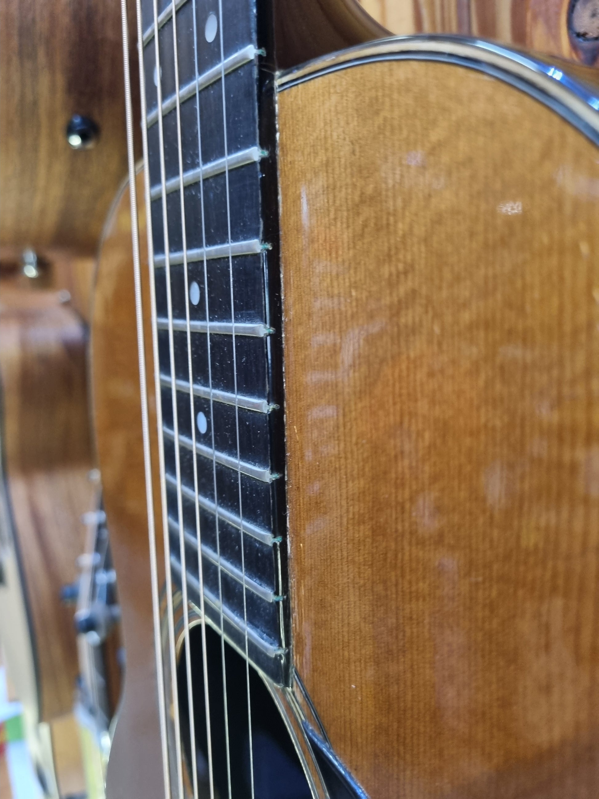 This guitar was assessed and set up before it made it's way onto our wall. Part of the fingerboard was reglued and it had some loose frets tapped back into place. The machine heads are non original. It has likely been resprayed with a poly finish. It's unclear as to whether it's had a neck reset.