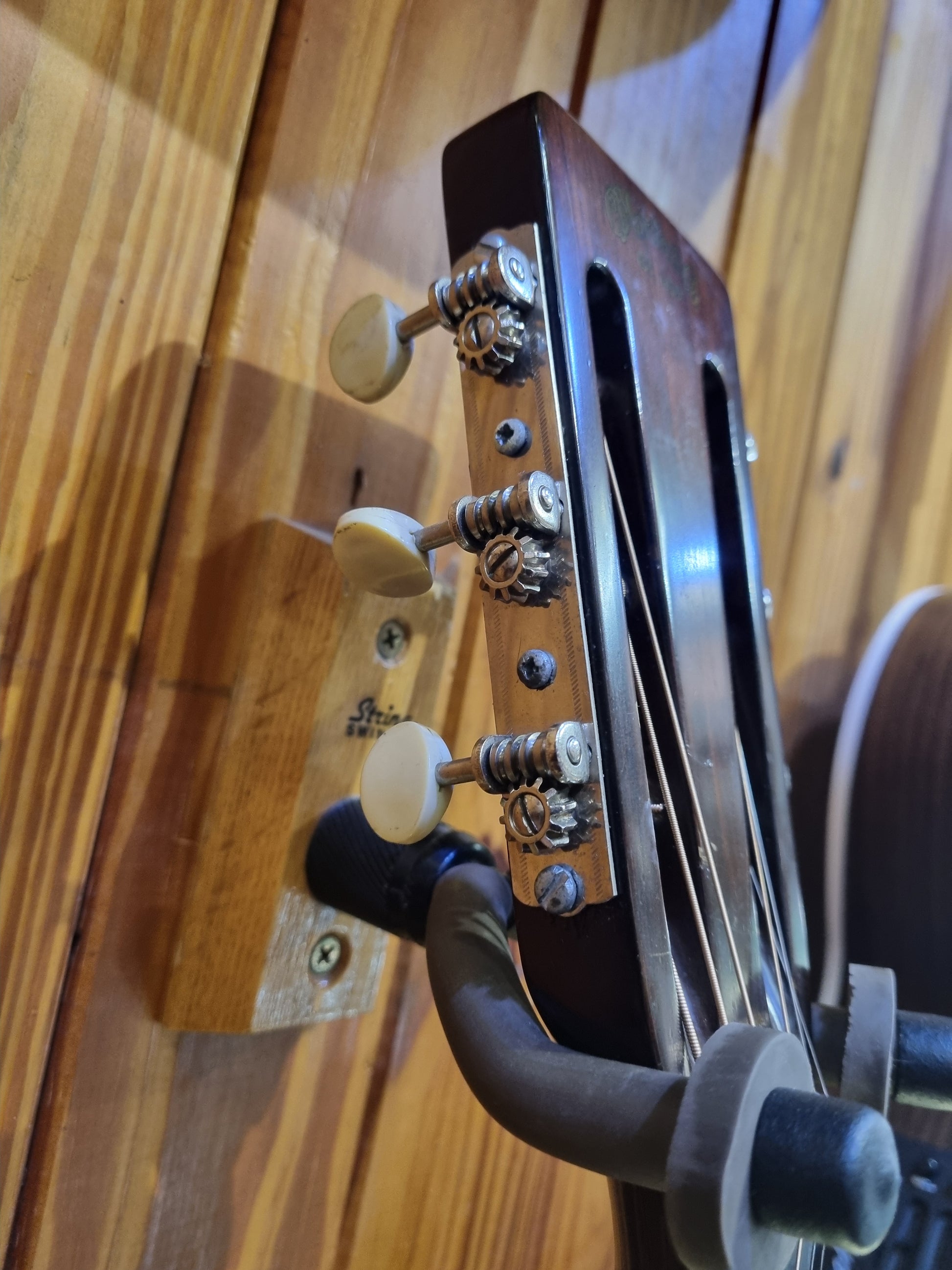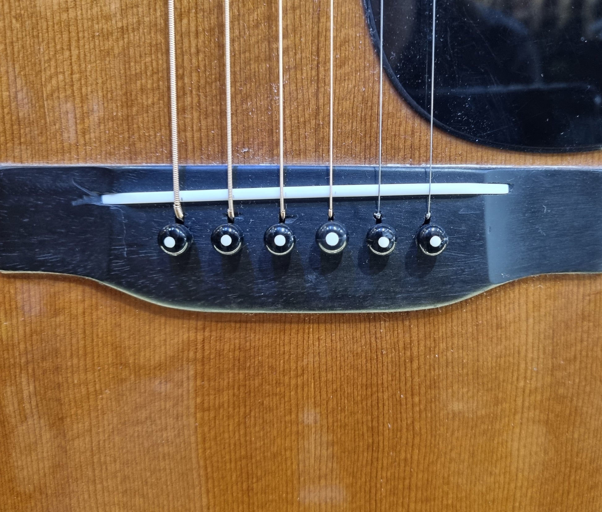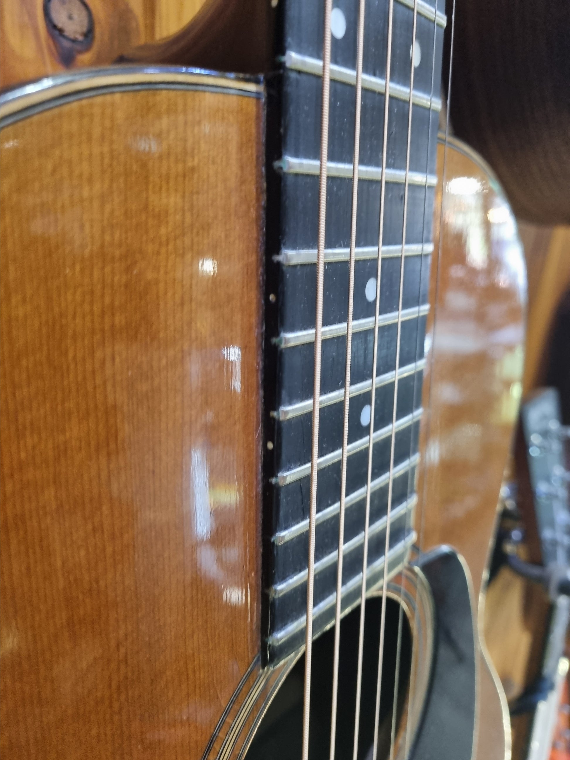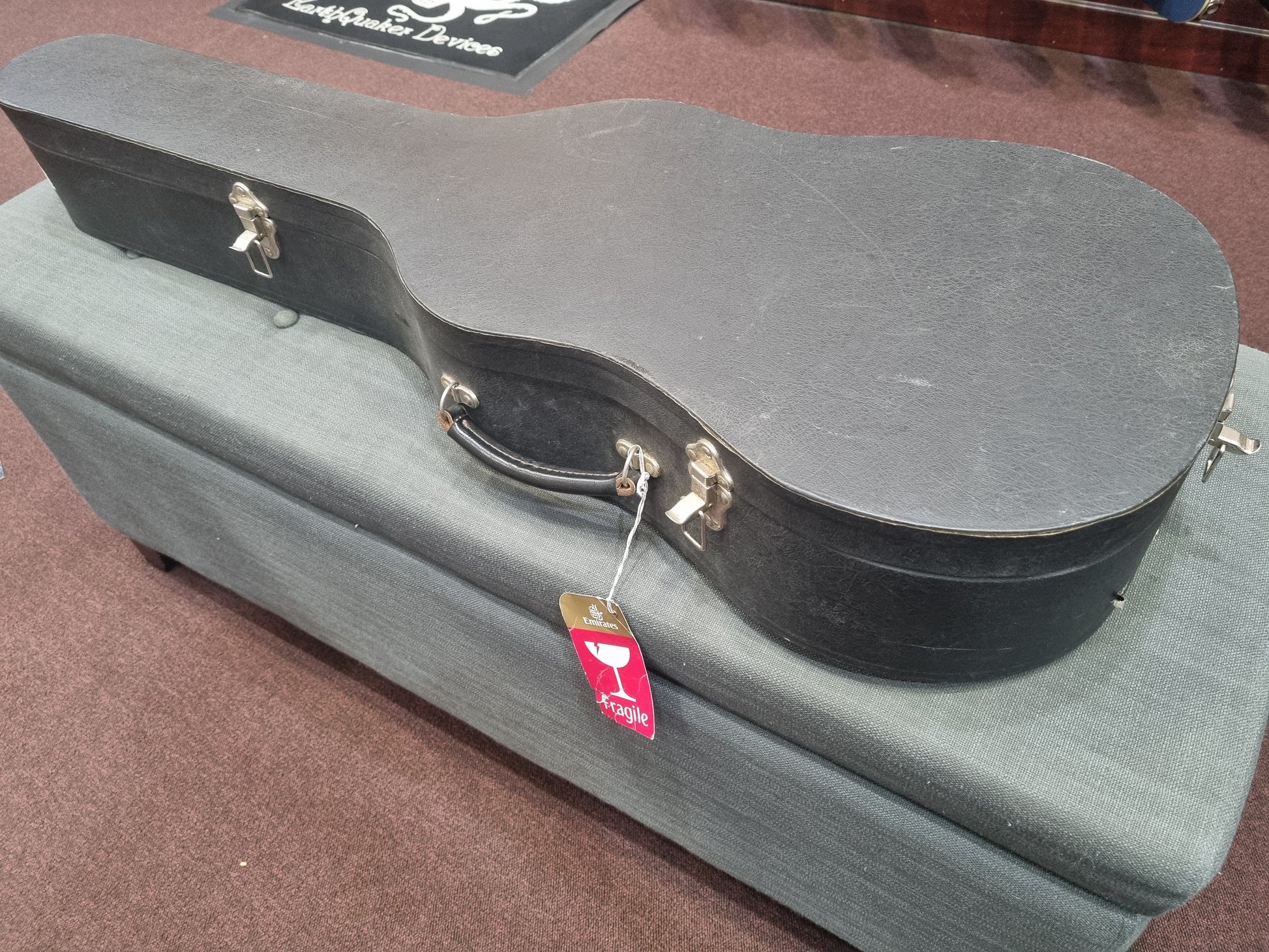 This guitar was assessed and set up before it made it's way onto our wall. Part of the fingerboard was reglued and it had some loose frets tapped back into place. The machine heads are non original. It has likely been resprayed with a poly finish. It's unclear as to whether it's had a neck reset.