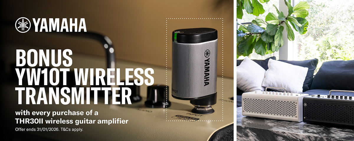 From 1st October 2025 to 28th February 2026, purchase a THR30IIA or THR30II Amplifier and receive a free YW10T Wireless Transmitter, RRP $249.99. All you need to register with Yamaha is the serial number of your amplifier + your Guitar Brothers receipt, and you can claim your free transmitter here.